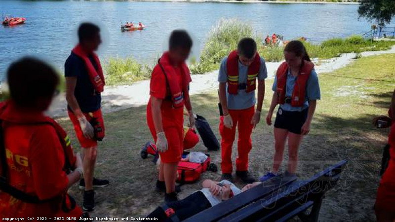 Nach dem Mittagessen wurde unser Stationsalarm ausgelöst. Unser vierter Einsatz: Erste Hilfe Einsatz auf der Rettbergsaue. Ein Verletztendarsteller der Realistischen-Unfall-Darstellung der JUH Wiesbaden spielte für uns eine Person, die sich den Fuß verletzt hatte. In diesem Fall verarzteten wir den Fuß vor Ort und transportierten die Person mit unserem Spinboard zum Boot und mit dem Boot zurück zu unserer Rettungsstation.